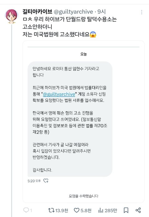 트위터 넴드 하나 미국법원에 고소해서 미국에 기사뜨고 그거 본 기자가 계정주한테 연락왔다고 계정주가 올렸더라