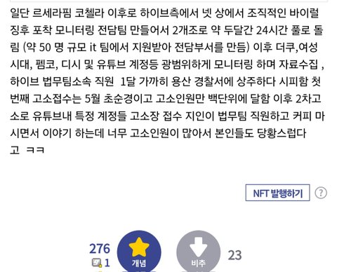 하이브에서 르세라핌 전담팀 만들어서 작년 5월 초부터 계속 관련 고소건 확인하면서 접수하는중인가봄