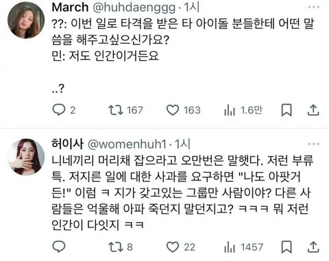민희진이 대인배 마인드로 다음 챕터로 넘어가자고 했으면 하이브도 진심은 아니더라도 민희진한테 사과하고 아티스트들 동등대우하겠다, 새롭게 시작해보자고 해야지 멍청해서 끝까지 지들이 키운 아이돌들 진창에서 못 구하네 하이브가 뻔뻔하게 구니까 민희진이 유감이다 이런 한 마디를 안 해주는 거야