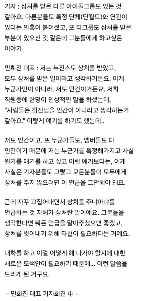 둘 싸움에 피해입은 아이돌들 있는거 맞잖아 본인이 의도했든 의도하지 않았든 언급되어 피해입고 상처받은 아이돌들한테는 사과해야하는거 아님? 자기랑 자기자식만 챙기는 극성충맘 같아서 이 부분은 좀 안 좋게 보임 어른 싸움에 아이들이 상처받았으면 어른들이 사과해야하는것 많잖아 그분들을 위하는게 그냥 언급하지 않는거래 이게 맞음? 일단 사과로 해결하고 추후에 더 이상 언급 안 하는게 맞지 그래야 방시혁도 뉴진스한테 사과할 수 있다고 생각함 적어도 저런식의 답은 아닌것 같음