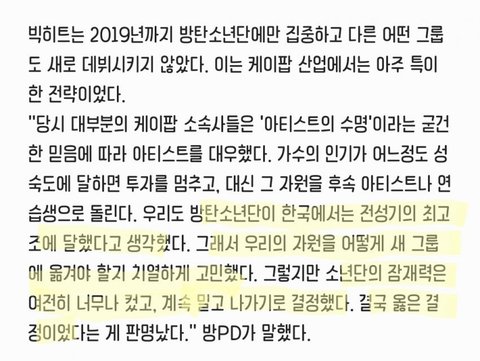 그러니까 20년이 아니라 이미 171819년부터 의존도 이 지랄할 생각이었다는 거네? 저렇게 생각해서 겨우 몇년 미뤘을 뿐 20년부터는 의존도 이 지랄하면서 원래 생각하던대로 방탄 후려치기랑 방탄 인력 전부 빼서 푸대접 들어가다 개이브 이렇게 망하게 된거고? 이 회사는 진짜 망해야 됨ㅋㅋㅋㅋㅋㅋㅋㅋ 저 후려치기 안 하고 제대로 고소하고 방탄 관련 제대로 일하기만 했어도 아미들이 개이브를 이렇게 극혐하게 되지는 않았음ㅋㅋㅋㅋ 그냥 망하라고 해ㅇㅇ