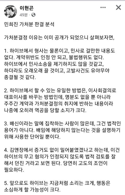 판사출신 변호사가 민희진 가처분 판결문 해석해주심