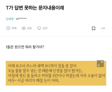 ㅈㄴ티병걸렸나,,,이궁~고생했네 ㅜㅜ얼른 퇴근하고 맛난거 먹으면서 편하게 푹 쉬어~ 이러지...보통 사회성이 있는 사람이면.,,,나도T인데 댓글들 ㄹㅇ사회생활 어케함