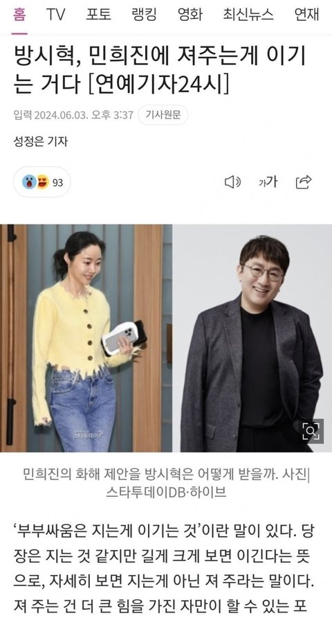 민희진이 화해 요청했는데 그걸 덥썩 수락하기는 자존심 상하고 그렇다고 계속 척 지기엔 본인 리스크가 크니 큰 사람이 져주자라는 모양새 그리려는 빅픽쳐(라기엔 모두가 의도를 알아차린 스몰픽쳐) 그리는거 아님? 그래도 방셕 체면도 있으니 다같이 흐린 눈 해주자 저렇게 해서라도 민희진 뉴진스 냅둬준다면