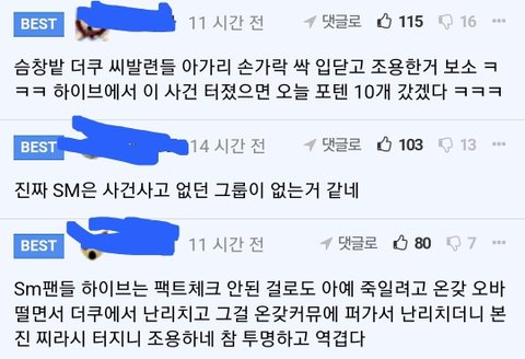거기 회원가입 막아둔 지 오래되서 더 고인물인듯... 진짜 다른 소속사돌들 논란 올라오면 엄청 패는데 슴돌일때는 상대적으로 패는 여론도 적어서 확 티남.
