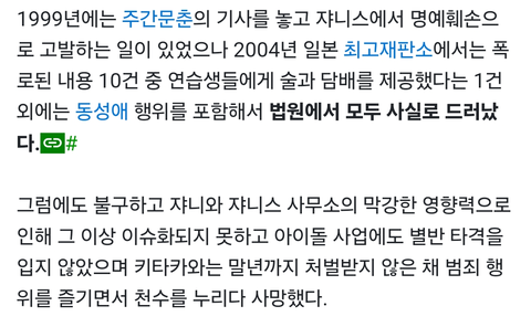 쟈니스가 진짜 악질인게 사실보도한 언론 허위사실에 기한 명예훼손으로 고소해서 일본 대법원(최고재판소)까지 가게 만들었다가 거의 다 사실로 드러났다는 것임.... 근데 그걸 또 묻음 헐; 우리나라 소속사들은 제발 쟈니스처럼 사실인걸 다짜고짜 허위사실이라고 힘으로 찍어누르는 짓은 안 했으면 좋겠다ㅜ