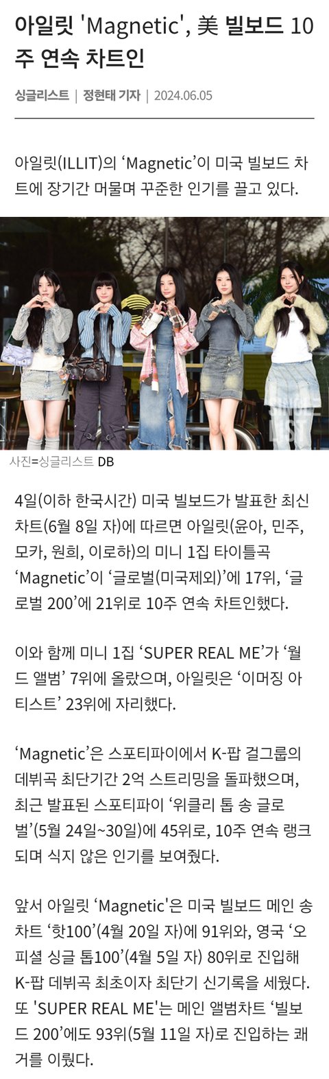 아일릿 'Magnetic', 美 빌보드 10주 연속 차트인