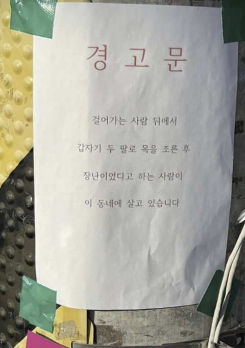 SBS <궁금한 이야기Y>에서는 인천 서구 지역에서 아래 경고문 내용과 같이, 걸어가는 행인의 뒤에서 목을 조르는 사람에 대해 취재중입니다.