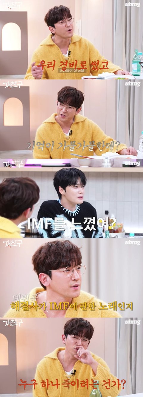 김재중은 "형 때는 그런 거 없었냐. 활동했을 때 IMF를 느꼈냐"고 궁금해했고 이민우는 "1997년도에 터진 거잖아. 사실 나는 '해결사'라는 곡이 IMF 관련돼서 나온 곡인지 몰랐다. 그때 너무 어렸다. '으쌰으쌰'로 후속곡 활동할 때 알게 된 것"이라 밝혔다.