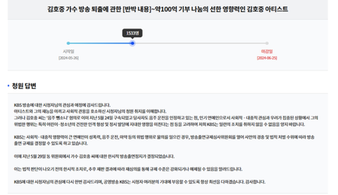 지난달 26일 KBS 시청자 청원 게시판에는 ‘김호중 가수 방송 퇴출에 관한 [반박 내용]~약100억 기부 나눔의 선한 영향력인 김호중 아티스트’라는 제목의 글이 올라왔다. 이 청원에 1533명이 동의했다.