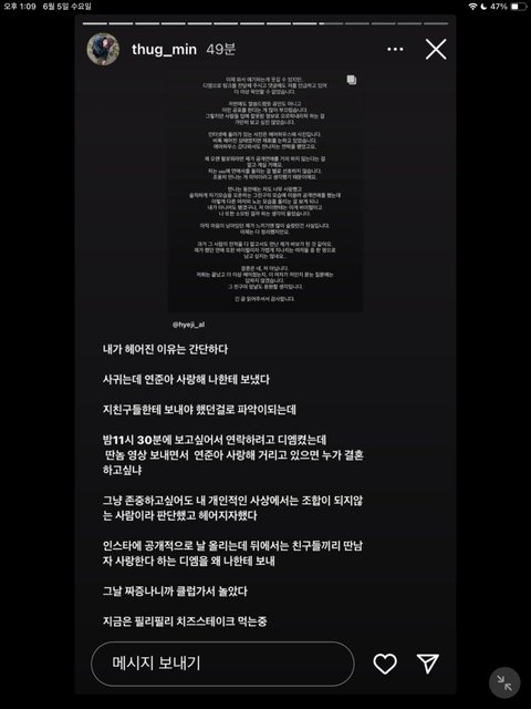 1. 떠그민이라는 의류브랜드 떠그클럽 대표가 여친과 헤어지고 인스스 올림