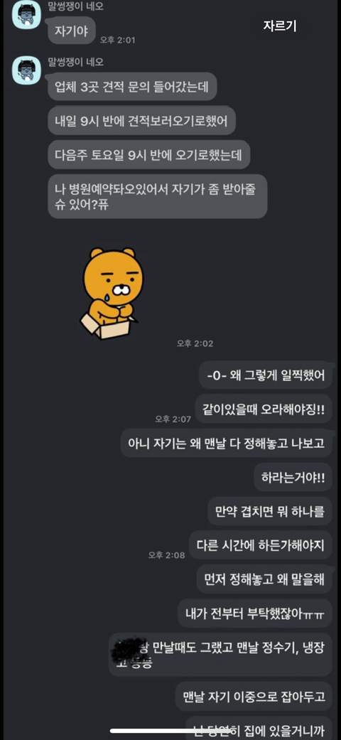 오늘도 비슷한 이유로 싸웠습니다.이번에 이사를 가게 되었는데 아직 한 달이 넘게 남은 상태입니다.그런데 오늘 카톡으로 이사견적 확인하러 이번 주말에 방문하기로 했는데 본인은 병원에 가야해서 저보고 대신 대응해 줄 수 있냐고 물어보는데진짜 짜증이 확 나더라구요 아니 대체 왜 맨날 그러는 건지주말에 하루종일 병원에 있는 것도 아니고 잠시 오전에 갔다 오는 걸텐데 왜 굳이 같은 시간에 잡아서 왜 계속 이런 반복 된 상황을 만드는 건지 이해도 안 가고 본인이 처리하지 못할 일을 두개 잡아놓고 저한테 떠넘기듯 하는건지 이해가 안갑니다.저 시간에 남편이 집에 있으면 저랑 같이 대응하면 되는 거겠죠 저는 저렇게 견적 받는다는 얘기도 듣지 못했고 본인 멋대로 예약했습니다.