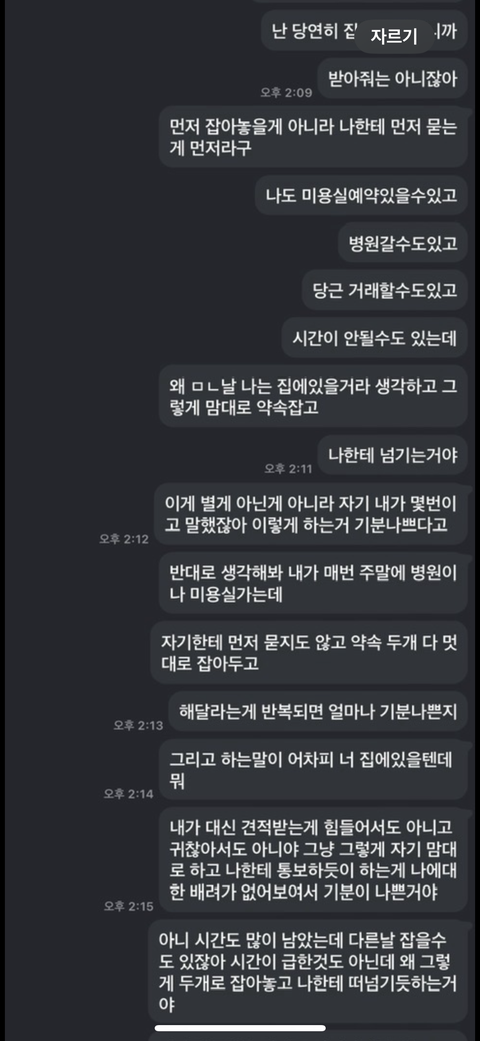 저는 부탁을 들어주기 귀찮아서 그러는 것도 하기 싫어서 그러는 것도 아닙니다. 제가 당연히 집에 있을 거라고 치부하고 저에게 먼저 묻지도 않고 당연히 해줄 거라고 생각하고 약속 잡는 부분이 저에 대한 배려가 없다고 생각이 들어요.물론 급하고 그때 밖에 시간이 안 된다고 한거면 저도 이해하고 들어주는 게 당연합니다.근데 그런게 아니라 계속 이렇게 당연하게 묻지도 않고 예약하고 심지어 제가 싫다고 말했는데도 이런 상황이 여러번 반복되니 저를 무시하는 건가 라는 생각까지 듭니다.먼저 저한테 물어보고 예약 잡는 게 그렇게 힘든 걸까요?