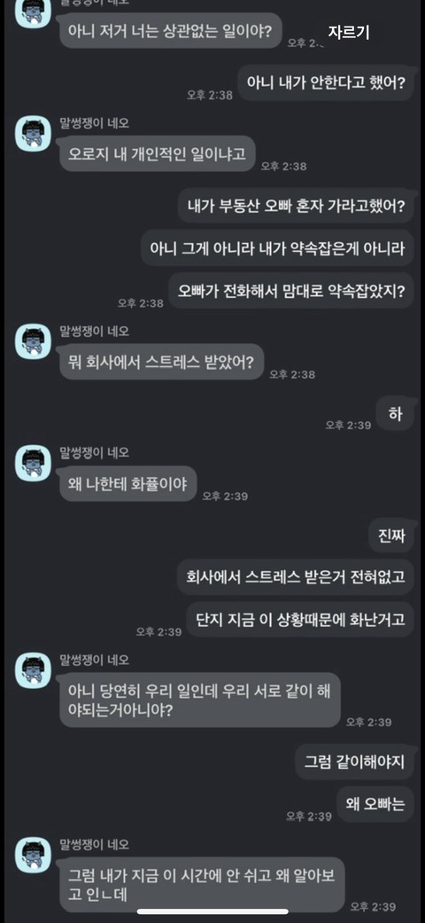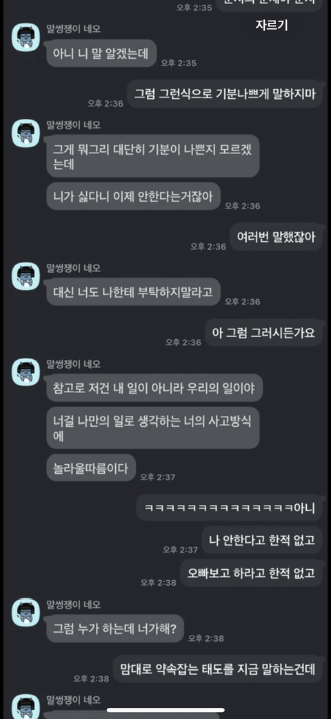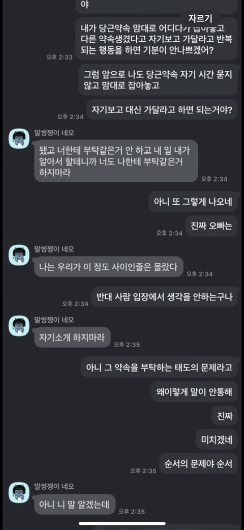 하..너무 스트레스 받아서 카톡으로 쓰다가 전화를 걸었습니다.역시나 제가 생각한대로 방어적으로 대답을 하더군요.. "그게 뭐 힘들다고 그러냐.", "니가 안 된다고 하면 취소하면 되는 거 아니냐.", "너도 나한테 이제 부탁하지 말아라." 등등 항상 똑같은 레파토리로 말을 합니다.제가 기분나빠하는 부분이 이해가 안 간다고 합니다.그래서 제가 다른 사람들한테 제가 화내는 이 상황이 이해 안 가는지 제가 별거 아닌걸로 그러는 건지 물어본다고 했습니다.
