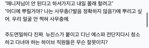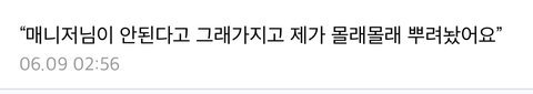 난 챌린지 까지는 좋아보였는데 이건 좀 너무 간 것 같아 둘이 챌린지 한 것 만으로도 충분히 ㅂㅅㅎ한테 한 방 먹였다고 생각하는데 매니저가 말렸다는데도 왜 굳이 몰래 하는지도 모르겠음 타가수나 매니저나 다른 직원들한테 민폐아닌가 싶고 그냥 적당히 하면 편들어줄 사람 많은데 왜 이렇게 까지 한건지 이해는 잘 안 됨 시킨 사람이나 하는 사람이나 똑같아 보였는데 팬들이 이걸로 영업하는거 보고 나랑 생각이 다른 사람들이 참 많구나 생각함