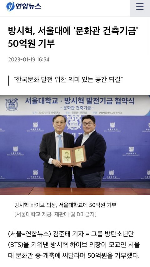 방시혁 기부도 한번에 50억하네