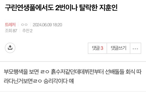 준규팬이든 지훈이팬이든 누구팬이든 간에 타멤들 욕할시간에 자기 최애 사진이나 더 보고 칭찬이나 해라 자기 최애만 트레저인것도 아니고 다 같은 팀인데 왜 까질함? 저래서 준규나 지훈이나 애들한테 도움이 될거라 생각하나? 저런 욕쳐박고 싸울시간에 자기최애 칭찬하는 글이나 써라 제발