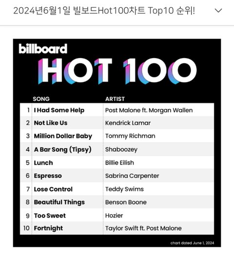 6월1일자 빌보드차트 핫백 Top10