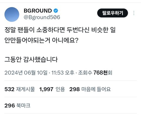 엑소판에 남아 있으면서 할말 뒤지게 많았을텐데 세줄만 띡남기고 클로즈하는것도 진짜 사랑했어서 그런거임 저 홈마 욕하지마라 진짜 끝까지 할말 참고 떠난거임