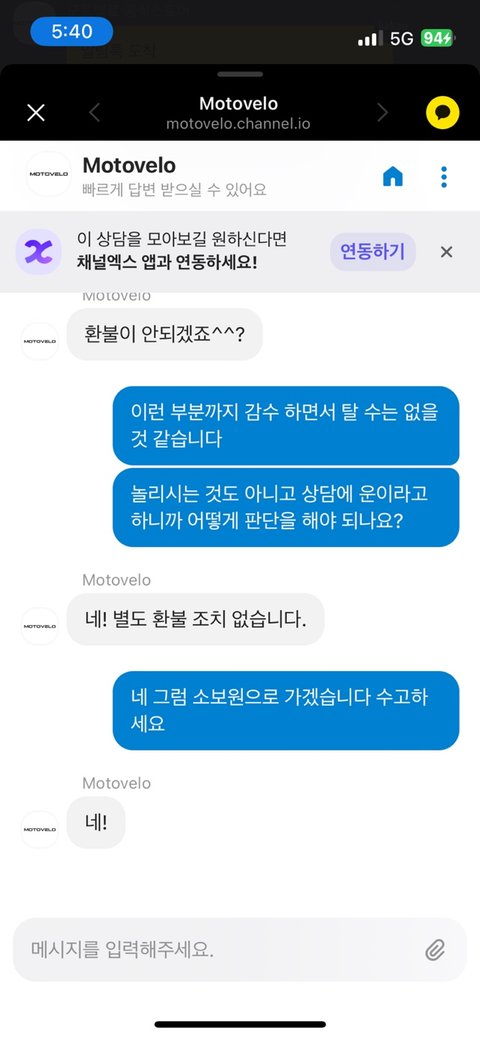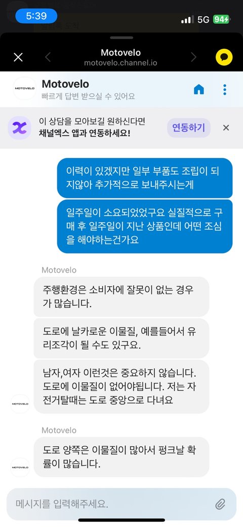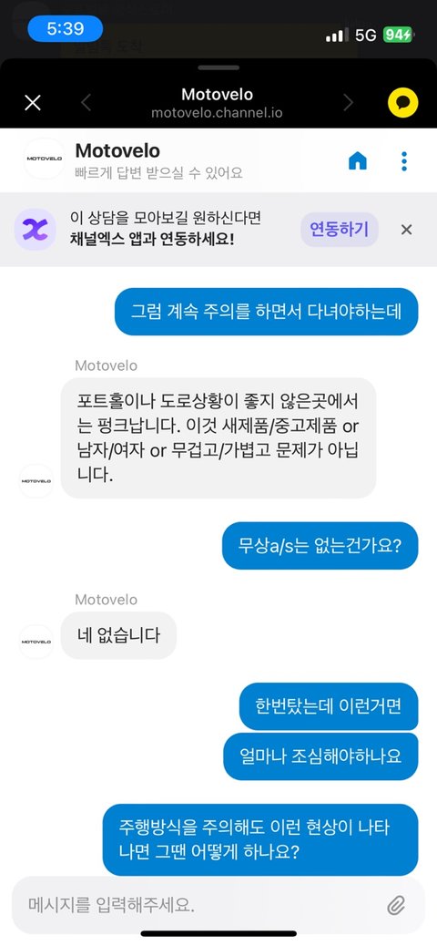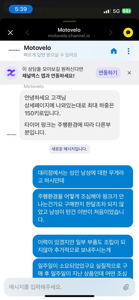 3시 50분에 문의요청 했고 상담이 한시간 뒤에 답변을 받았음 강제로 종료될 수 없었고 대응이 놀림을 받는거같았음 - >환불요청(사유:최대하중 150kg이내 제품을 타지 못함/도보를 잘 보고 다녀야함(자전거는 생명수단입니다. 땅바닥을 보고 다닐 수 없습니다.기존에 타고다니던 전기자전거는 운이 좋아서 4년을 탔다?)