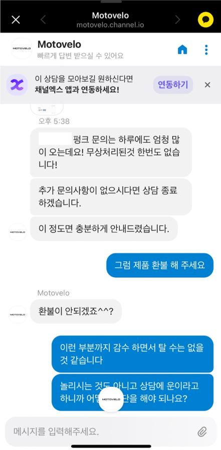 8. 하자라는 답변을 받고싶으시겠지만 그럴 일은 0%다 라는 식의 이상한 답변 -> 펑크에 대한 문의가 하루에도 많이 온다며 강제 상담 종료를 하려고함