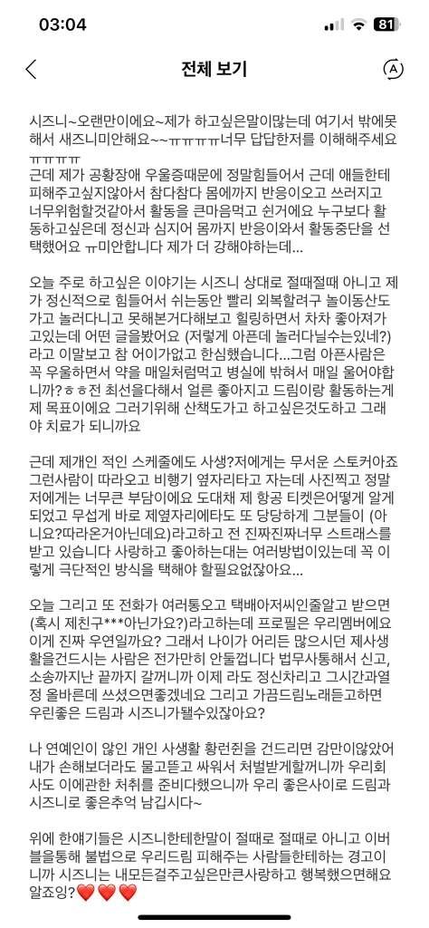 근데 진짜 아프고 힘든 거 차라리 저렇게 티내주는 게 다행임… 저렇게 치료받고 나으려고 하는 거 너무 다행스러운 거임 혼자 다 숨겨두고 앓다가 터지는 거보다 진짜 그냥 저게 훨씬 나음 사생들 진짜 그만 괴롭히고 회사에서도 아티스트가 저렇게 해결하려고 하기 전에 알아서 대응 좀 잘 해줬으면…