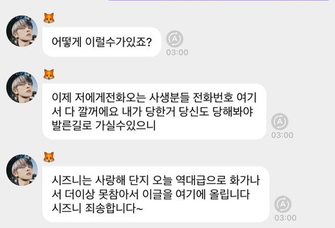 저 정도면 정병 안걸리는게 이상하지 사생이 말이 사생이지 그냥 스토커 범죄 아니냐, 선처없이 고소 가자 공황장애나 우울증은 원인을 없애지않으면 근본적으로 치료가 어려워 절대 봐주지말길, 이건 드림이들이나 타돌들을 위해서도 본보기로 그래줘야할 필요있음! 그리고 쉬는 애 좀 가만 냅둬라 쫌.. 런쥔이 화이팅! 쉴수있을만큼 푹 쉬고 돌아와!!