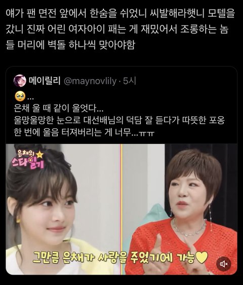 대선배님이 은채 안아주실때 나도 울컥했어ㅜ..... 사랑은 일방통행이 안된다고 은채가 팬들한테 사랑을 주니까 팬들도 은채한테 사랑을 주는거라는 말이 너무 좋았음.... 헹 행복하자 은채야