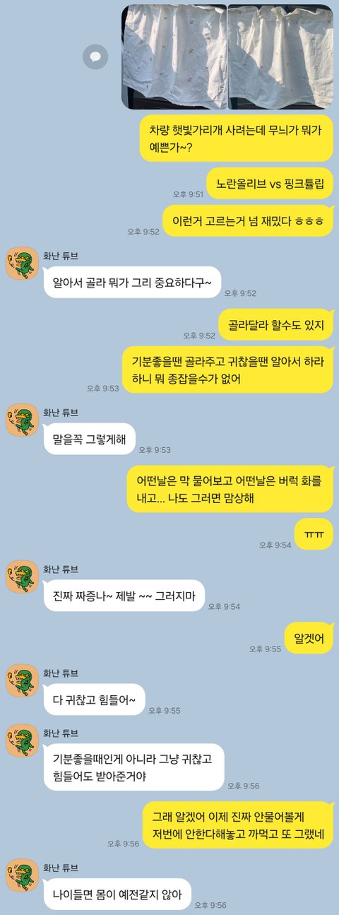 며칠전에 애기용품 보여주면서 A가 예쁘냐 B가 예쁘냐 물었더니 귀찮고 짜증나니까 물어보지 말라해서 맘상해서 한동안 입 닫고 있다가