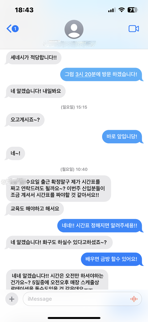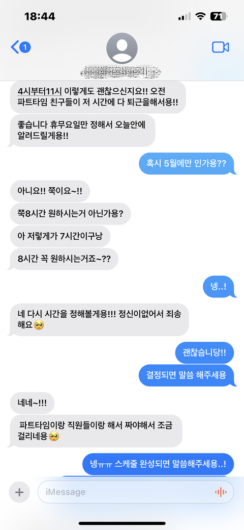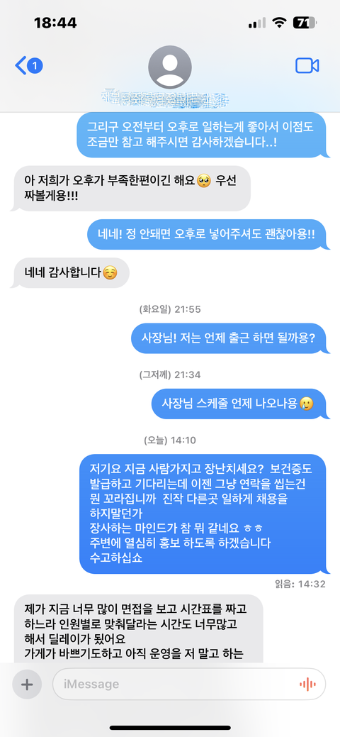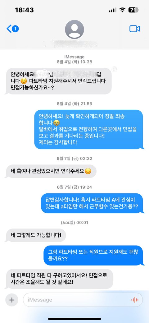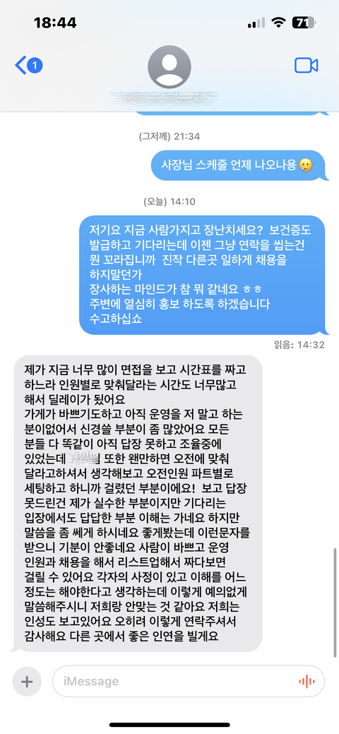 요즘엔 알바생들 인성면접을 문자 이틀 씹으면서 얼마나 인내심 좋은지 테스트 하나보네요
