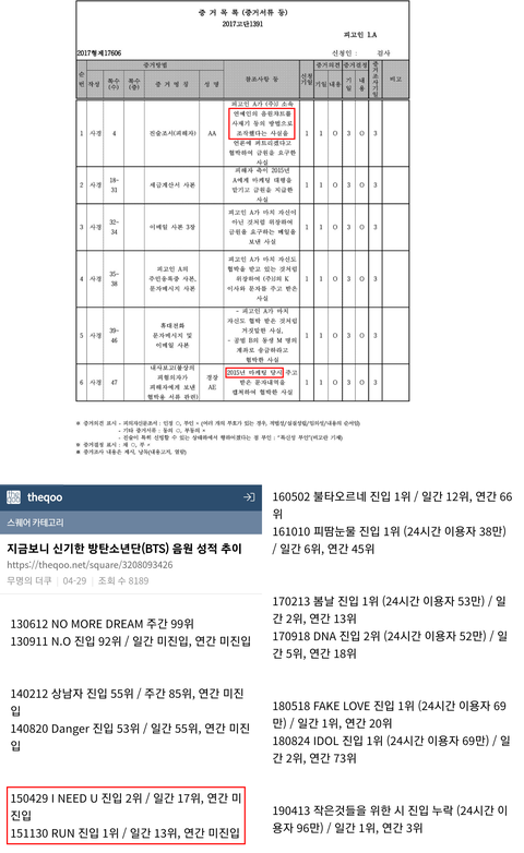 저 재판의 쟁점은 피고인이 사재기를 했냐 안했냐가 아니고 공갈 협박을 했는지 안했는지 이거 따지는 거임 저 증거목록 1번에 있는 피해자 진술조서 보고 사재기라고 땅땅 결론 내린 것 같은데 저것만으로는 무리가 있지 왜냐 경찰이 조서 작성할 때 피해자는 피고인이 어떤 협박을 했는지 진술하는 것이 보통임 이 말은 즉 저 네모 박스에 있는 말은 피고인의 협박 내용을 인용한 것이고 이 협박이 찐인지 아닌지는 저 재판에선 중요치 않음 공갈죄를 가리는 재판이므로 폭행 또는 협박의 행위 여부 그리고 재산상의 이득을 취했는지 여부가 중요하지 협박 내용의 진실성을 판단하는 것은 공갈죄의 성립요건에 전혀 해당하지 않음 그리고 마케팅에 대해서도 어느 쪽에선 ‘불법’ 마케팅이라고도 하고 다른 쪽에선 ‘편법’ 마케팅이라고도 함 불법과 편법은 사실상 다른 것인데 한 판결문에 이렇게 명확하지 않은 표현을 쓴 것은 마케팅 자체에 대한 판단을 재판부에서 유보했기 때문으로 보여짐 위에서 말했듯이 어차피 협박 내용 즉 사재기 마케팅의 진위 여부를 가리는 게 중점인 재판이 아니니까 이상 잘 모르는 뇌피셜로 끄적거려봤는데 나도 틀릴 수 있고 너도 틀릴 수 있으니 피차 알못인 사람들끼리 함부로 낙인 찍지는 말자는 게 내 생각 끝