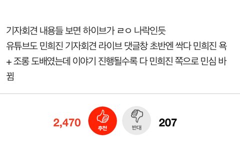 얘야 사람들이 니네 하이브편 안들어준다고 무조건 민희진 왜빨아줘!! 니네 민희진 알바들이지!!! 이지랄 떨지말고 여론을 봐 ㅋㅋㅋㅋ 하이브퀴들 드글드글한 판에서도 민희진 기자회견 이후로 민희진쪽 민심 돌어간글에 추천수가 2천개가 넘고 유튜브 인스타 등등 대중들 모여있는 sns나 커뮤에는 아예 추천수가 몇만개 단위로 전부 민희진 편이던데 그게 버니즈 화력, 민희진 빠들 화력으로 보여? ㅋㅋㅋㅋㅋㅋ 그냥 여론이야 여론... 언제까지 정신승리할래? ㅋㅋㅋ