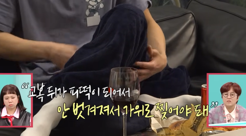 그래서 어쩔 수 없이 가위로 찢어서 벗고 그랬대