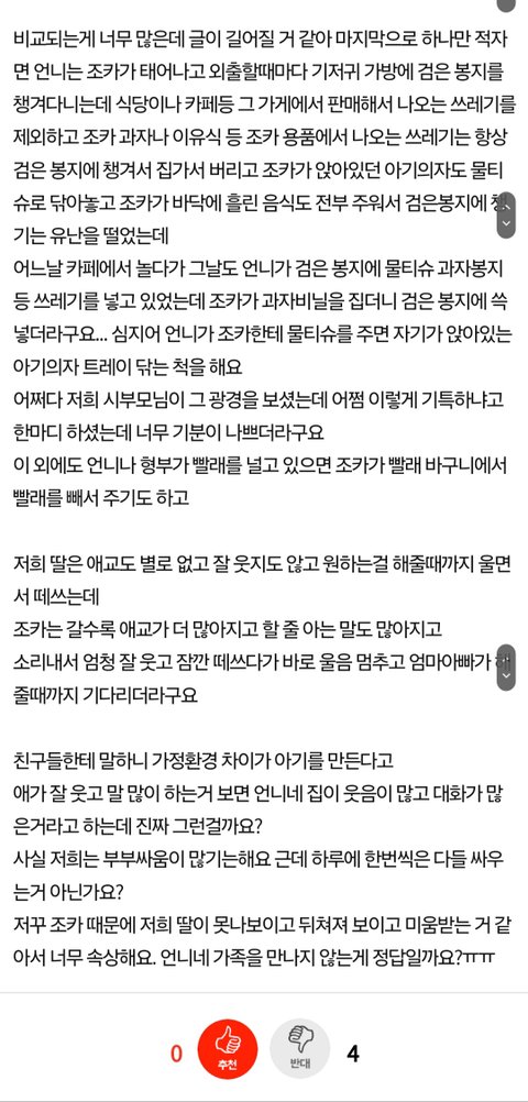 누가봐도 글쓴이가 이상한데 보통 저런 상황이면 나도 우리 아이 조카처럼 밝게 키워야지 하지 않나? 자기 애는 다 괜찮고 이제 12개월 된 아가한테 여우 같다고 하질 않나 성격이 저러니 맨날 부부싸움 하지