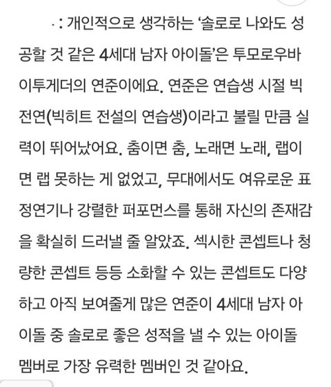 투바투 연준이 4세대 남돌 중 솔로로 나오면 좋은 성적 낼 것 같은 사람이라네