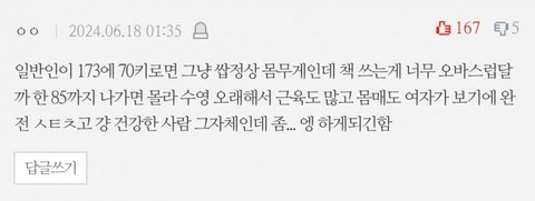 나 169 63~4 이럴 때도 덩치 장난 아니었는데 진짜 이게 정상 스펙이라고? 진짜 나 빼고 몰카함? 당연 근육 많은 사람 얘기하는 거 아님 답댓으로 지들끼리 이 정도면 정상이지 적당하지 이러고 앉았네 물론 173 70 뚱뚱하단 거 아님 근데 그렇다고 정상도 아니지 과체중 통통 맞지 않나