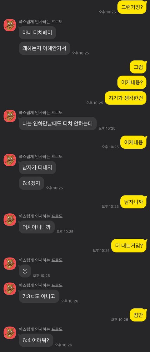 다름 아니고 여자친구랑 오늘 카톡을 하다가 약간 말싸움으로 번질뻔한 더치페이 얘기인데요. 여러분들 의견이 궁금합니다