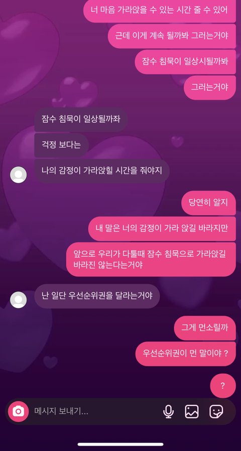 일반전화는 나 차단햇고 디엠으로 전화 거는것도 안받앙 ,,, 나랑 대화를 안하려해 ㅠㅠ
