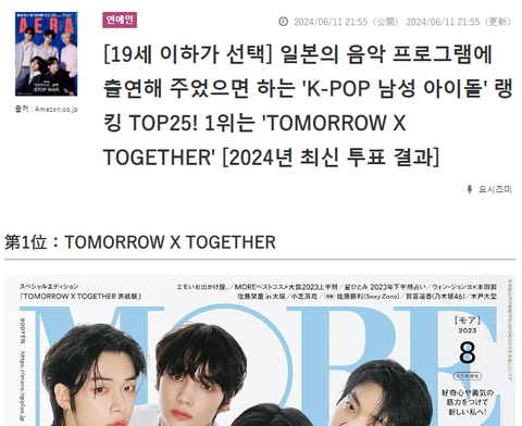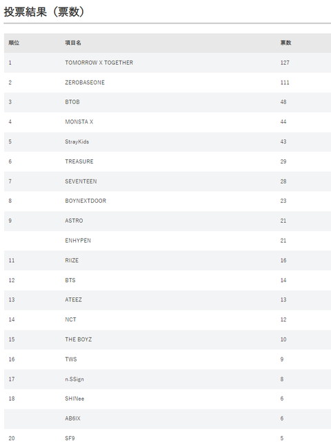 2024년 일본의 19세이하가 선택한 일본 음악방송에 나와줬으면 하는 케이팝 남그룹 순위