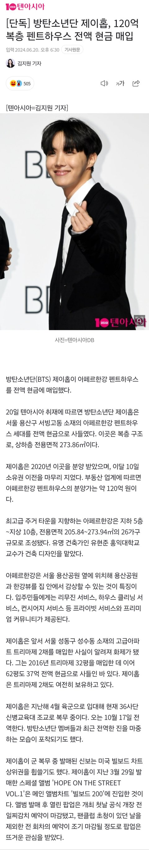 방탄 제이홉 기사 봤는데 120억 복층 펜트하우스 현금매입했대 전에도 현금 매입했던 성수동 트리마제 2채 여전히 가지고 있음 주택만 거의 230억 정도인데 자동차나 저 집에 맞는 가재도구 구입비용이나 헤메드 같은 품위유지비라고 해야하나? 암튼 고정적으로 나가는 비용도 어마어마할테 그런거 다 감안하면 천 억 이상은 돼야 저 정도 집을 현금 매입할 수 있지 않을까 생각함 저작권도 들어올거고 대단하다