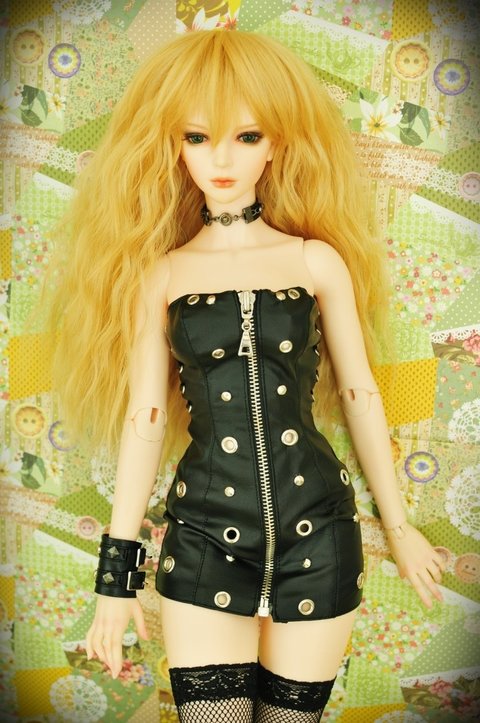 2. 펑크 가죽 드레스 : 징 박힌 디자인이 인상적인 가죽 미니 드레스 + 망사 스타킹 + 손목 가죽밴드까지... 락앤롤 스피릿이 느껴지는 의상입니다.