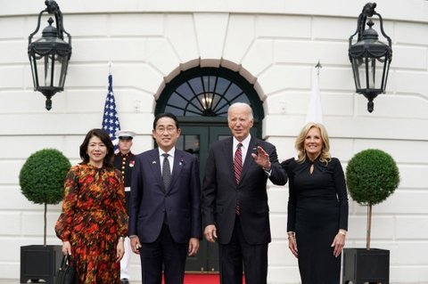 국빈 방미 일정을 시작한 기시다 후미오 일본 총리가 조 바이든 미국 대통령과 9일(현지시간) 백악관에서 만났다. 바이든 대통령 부부는 백악관 문 앞에서 기시다 총리와 부인 기시다 유코 여사를 맞이했고 “환영한다”고 거듭 말하는 등 격상되는 동맹 관계를 드러냈다.