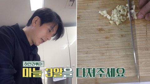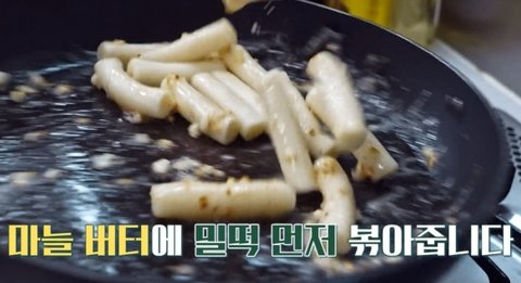 마늘 갈색으로 변할 때 밀떡 넣고 볶기