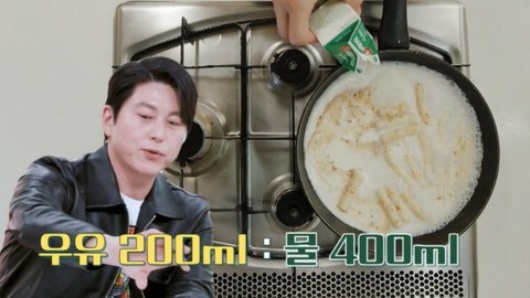 여기에 우유 200ml, 물 400ml 넣고 센 불에서 끓이기