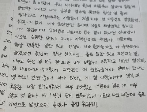 저 친구한테 기분나쁜 일 생겨도 저 편지 생각하며 몇번 넘어가주세요. 저도 정말 소중했던 친구가 있었는데 기분나쁜거 못참고 티내고 하다가 영영 잃었어요. 엄청 후회되지만 자초한 일이라 가슴앓이만 한답니다. 평생 소중한 우정 되길 바랄게요