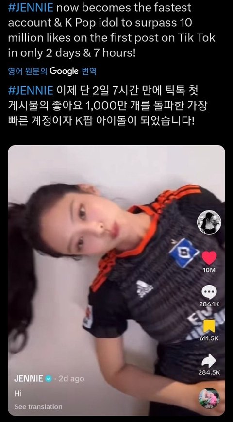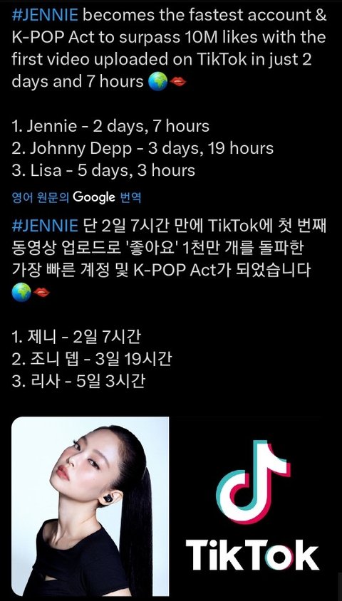 제니 틱톡 첫 영상이 틱톡 역대 계정 중 최단 기간 좋아요 1000만 달성했대 ...