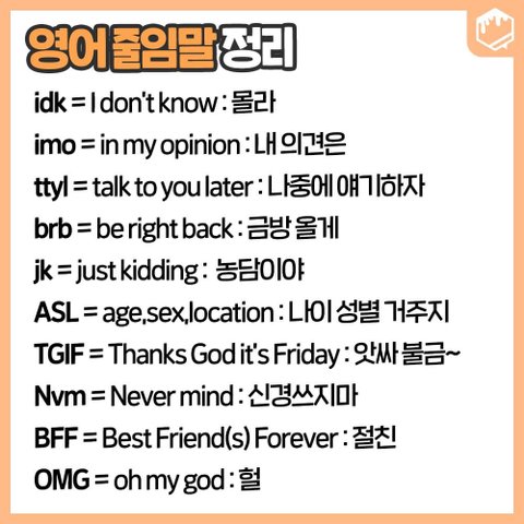 그리고 brb ttyl lol 이런거 보단 ong fr ngl gyat mid iykyk dub 이렇게 진짜 내 나이대 애들이 자주 쓰는걸 알려주는게 더 도움이 될거 같음