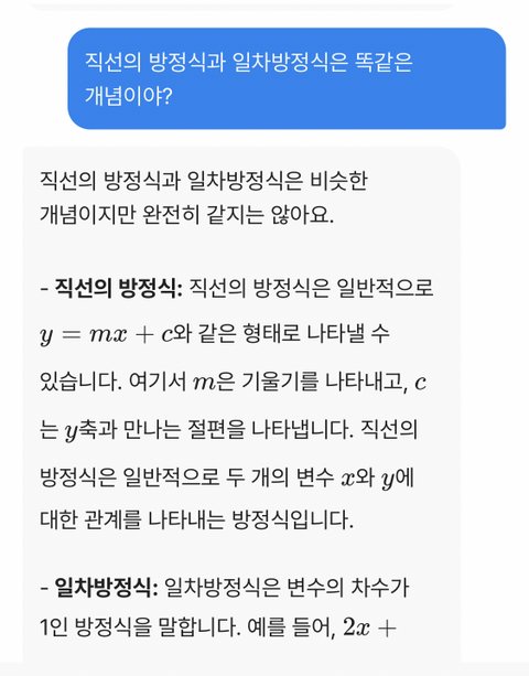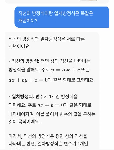 처음에는 직선의 방정식이랑 일차방정식이 서로 다른 개념 이라고 했으면서 나중에는 다시 물어보니까 비슷한 개념이라고 하더라구요 오류인가요? 똑같은 질문을 했는데 서로 다른 답변이 왜 나오는 건가요?