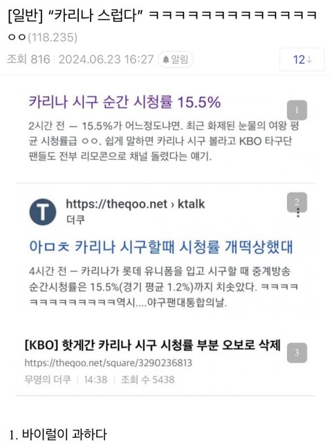 최근 릇퀴들 카리나한테 개빡친 이유 : 비타오백 광고 카리나한테 뺏겼는데 카리나로 모델 교체되자마자 광고 조회수 대박터짐 ㅇㅇ ㅋㅋㅋㅋㅋㅋ 카리나가 광고 뺏어서 미안~ 니네 눈나들보다 조회수까지 잘나와서버려서 미안~~ ㅋㅋ