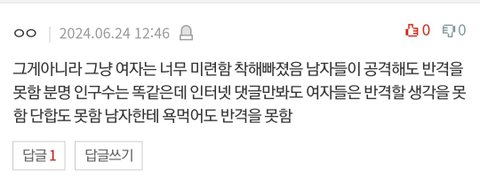 댓글보면 남자들은 자기들 욕먹으면 논리가 있든지 말든지 무지성으로 욕부터 박는데 여자들은 딱히 안 그런 거 같음 그래서 댓글창에 남자들이 무지성으로 장악하고있는거 많이봄